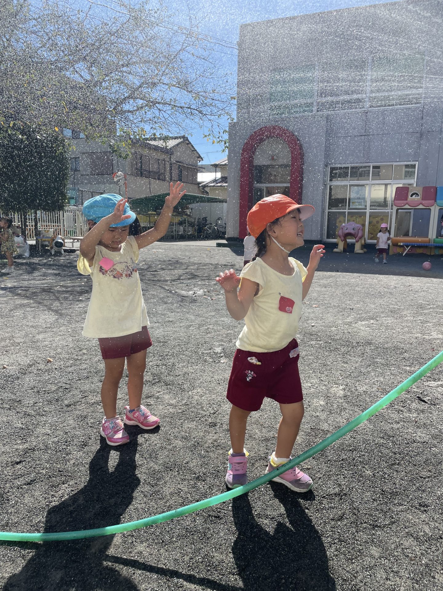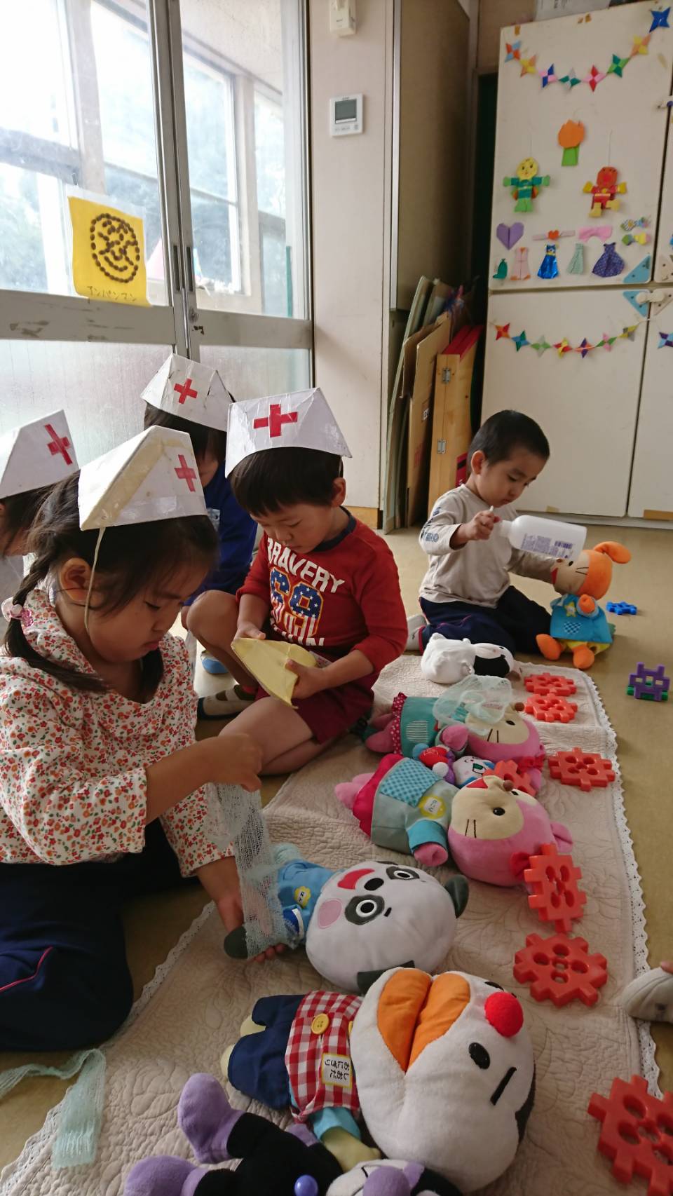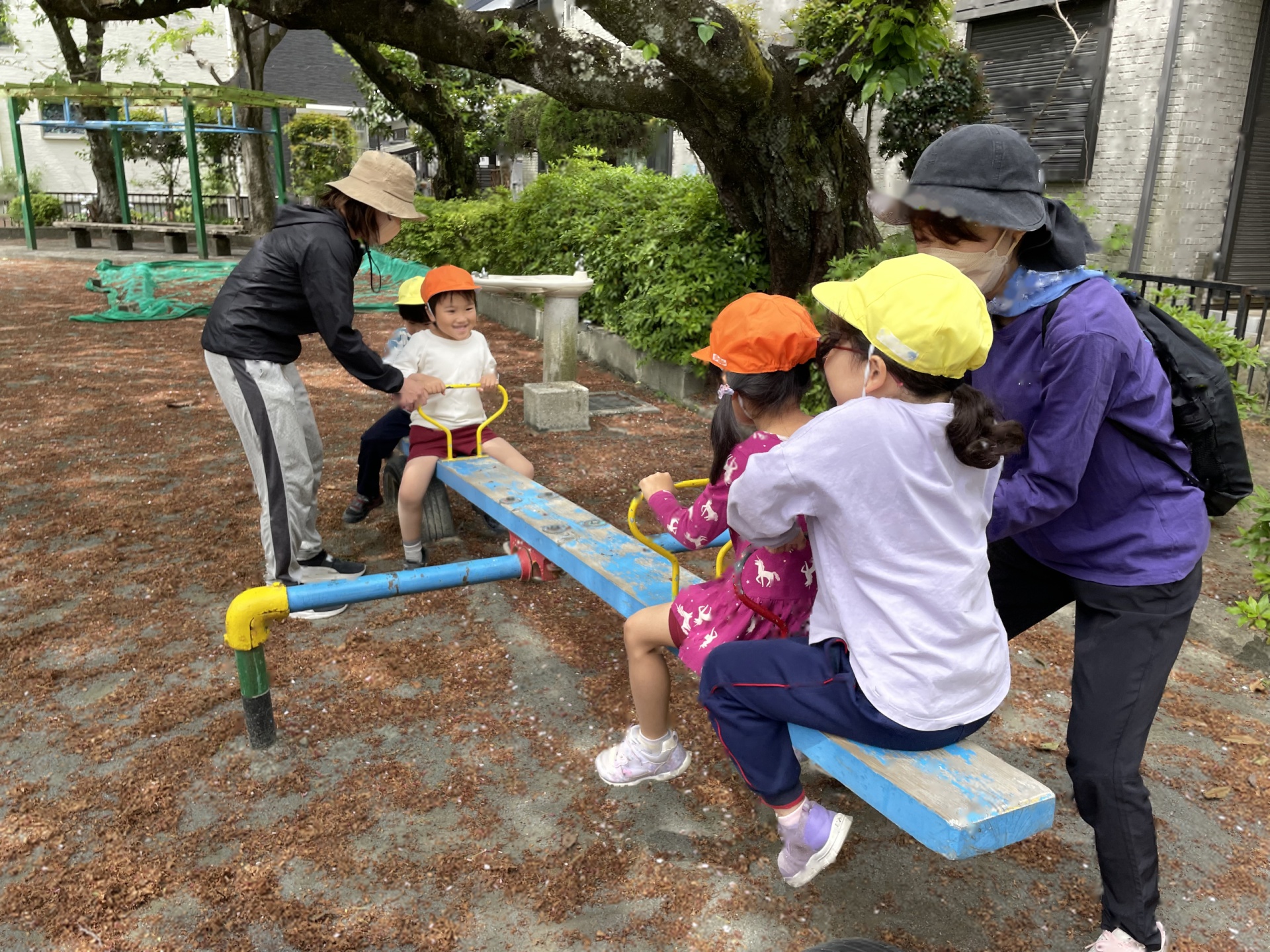 色んな学年の園児たちが、興味を持って遊びを共有している場面でした。